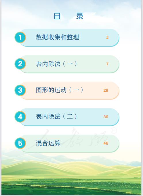 本册教学内容:除法、混合运算、方向与位置、生活中的大数、测量、整理与复习、加与减、认识图形、时分秒、数学好玩、调查与记录。