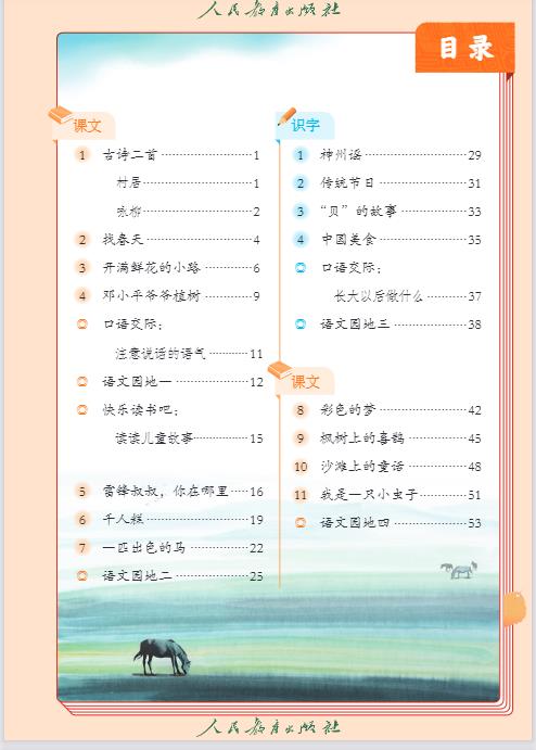 本册共有36篇课文。其中有6篇略读课文,它们只编排了两项课后练习;有识字任务,没有写字要求。“语文园地”包括四--五个栏目,新增了“宽带网”。“我的发现”——鼓励学生探究发现,引导学生了解汉字构字特点、词语之间的联系以及表达方法和标点应用等知识。“日积月累”——引导学生在复习已经学过的字词的同时学习生字新词,感受和强化词语之间的搭配习惯,并进行语文基础知识的综合练习,“日积月累”中增添了能突显中华文化的、与本组专题密切相关的成语韵语、对联、节气歌、古诗词等内容;它们使学生积累好词佳句、优秀段篇。“口语交际”——话题与本组专题有联系,在双向交流中培养学生的口语交际能力。为了对学生进行初步的习作能力的培养,在“口语交际”中特别增设了“写一写”栏目,引导学生在口语交际的基础上,进行写话训练。“展示台”——给学生提供展示课内外学习所得的舞台。“宽带网”——与本组专题密切相关,引导学生学习由课内向课外延伸,以获取更多的相关信息。教材最后是两个生字表。要求认识的字,有470个。要求会写的字,有330个。